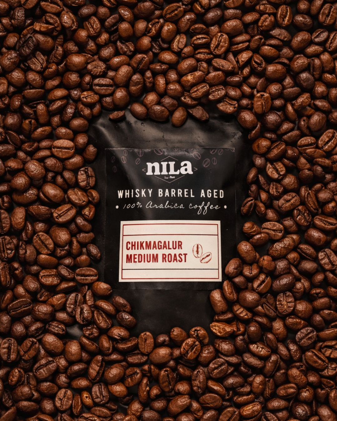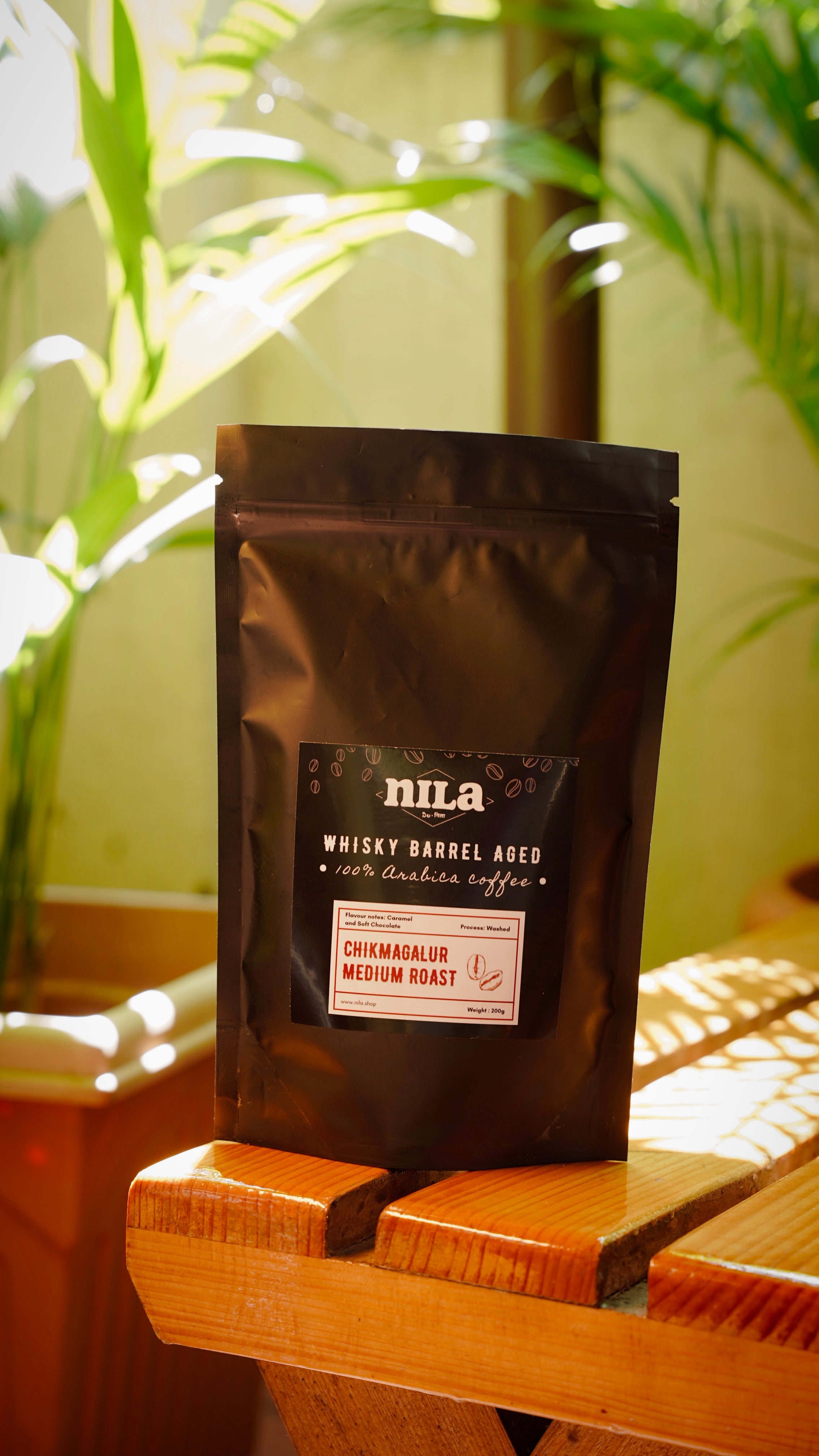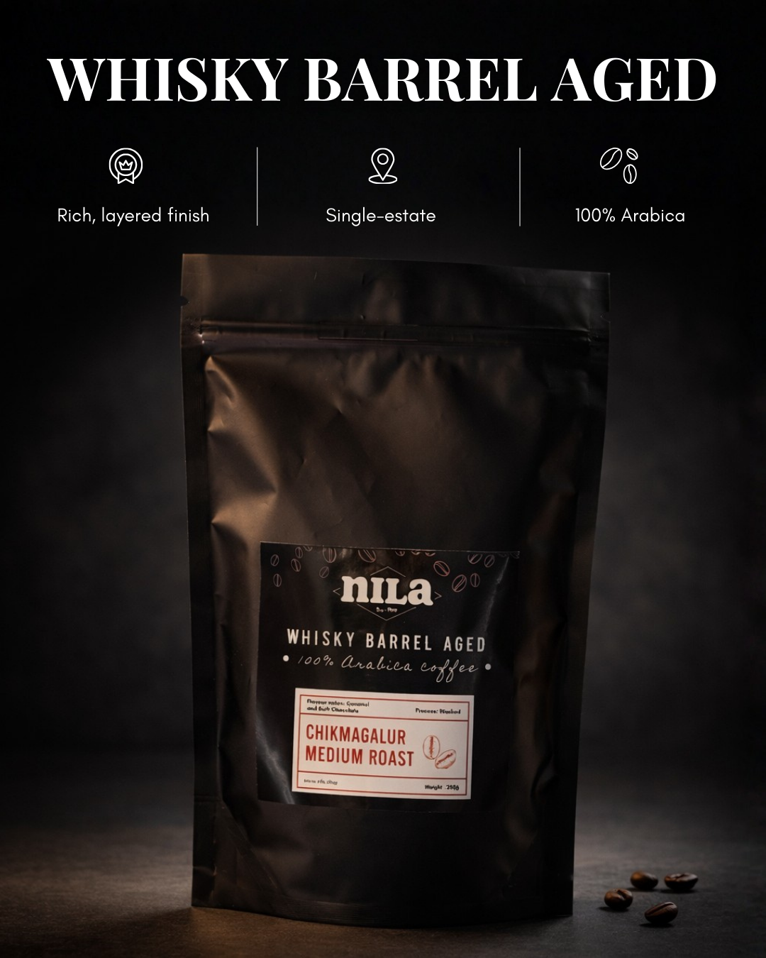 Sourced from a single estate in Chikmagalur, these Arabica beans are aged for two months in old whiskey barrels. The process gently deepens the coffee’s natural character, adding warmth and roundness — without overpowering it.