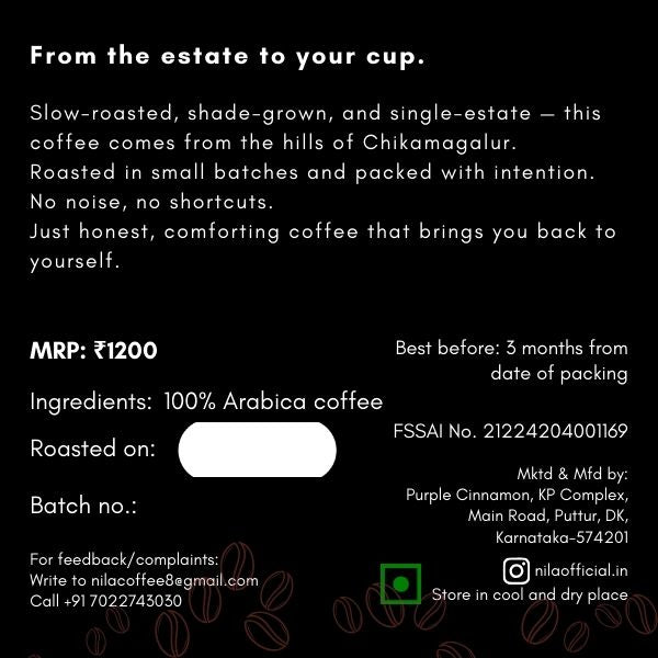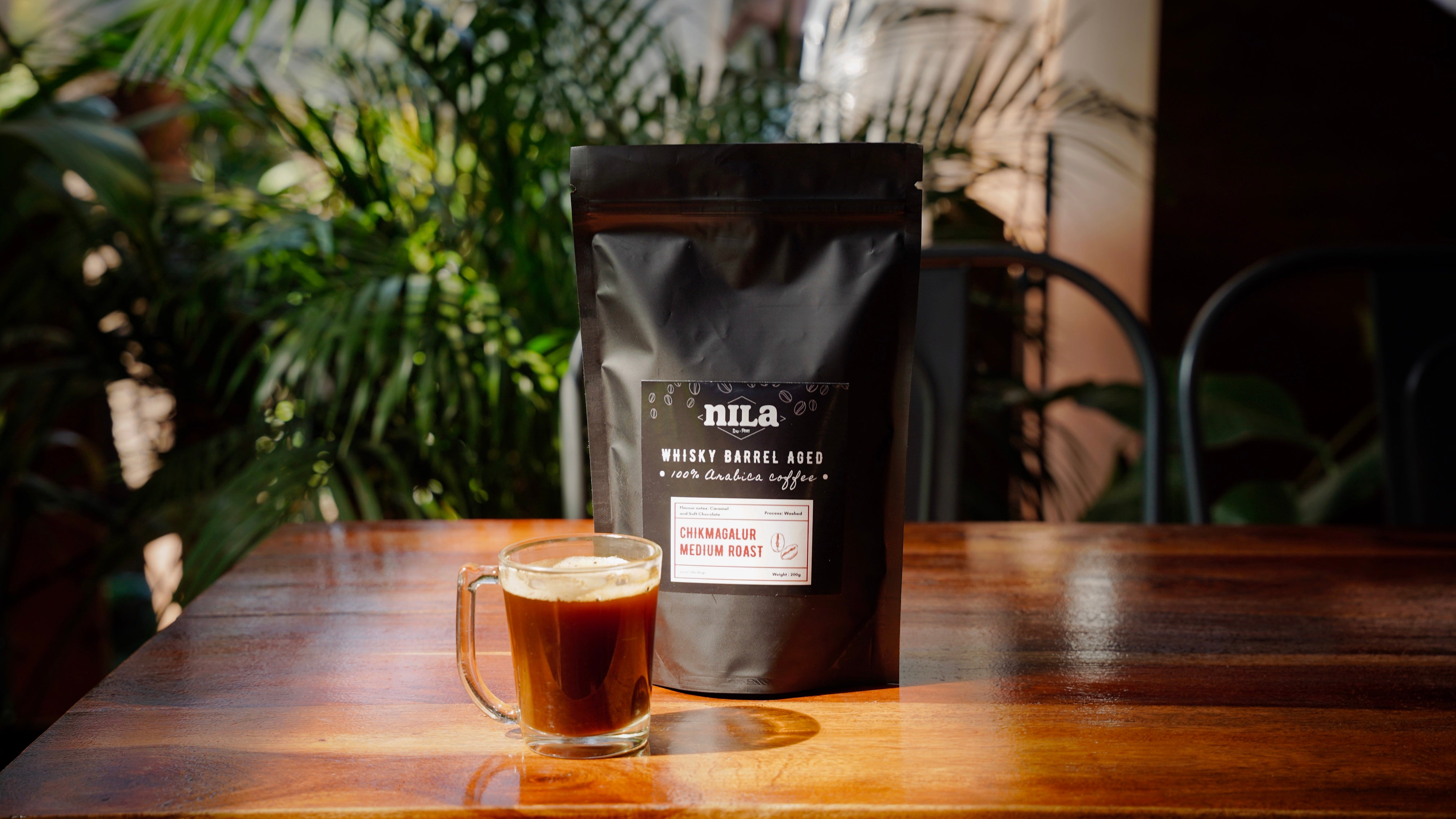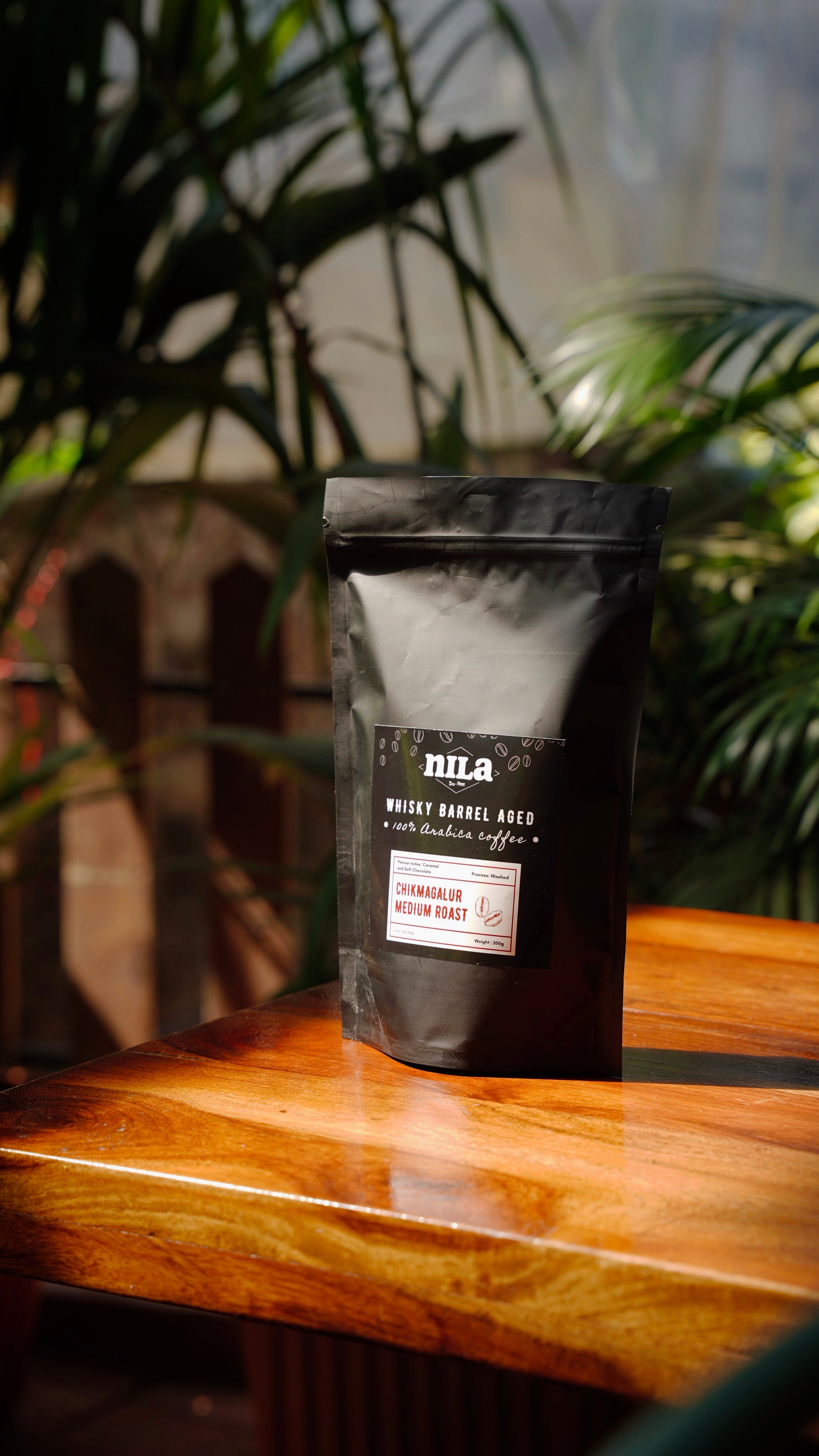 Sourced from a single estate in Chikmagalur, these Arabica beans are aged for two months in old whiskey barrels. The process gently deepens the coffee’s natural character, adding warmth and roundness — without overpowering it.